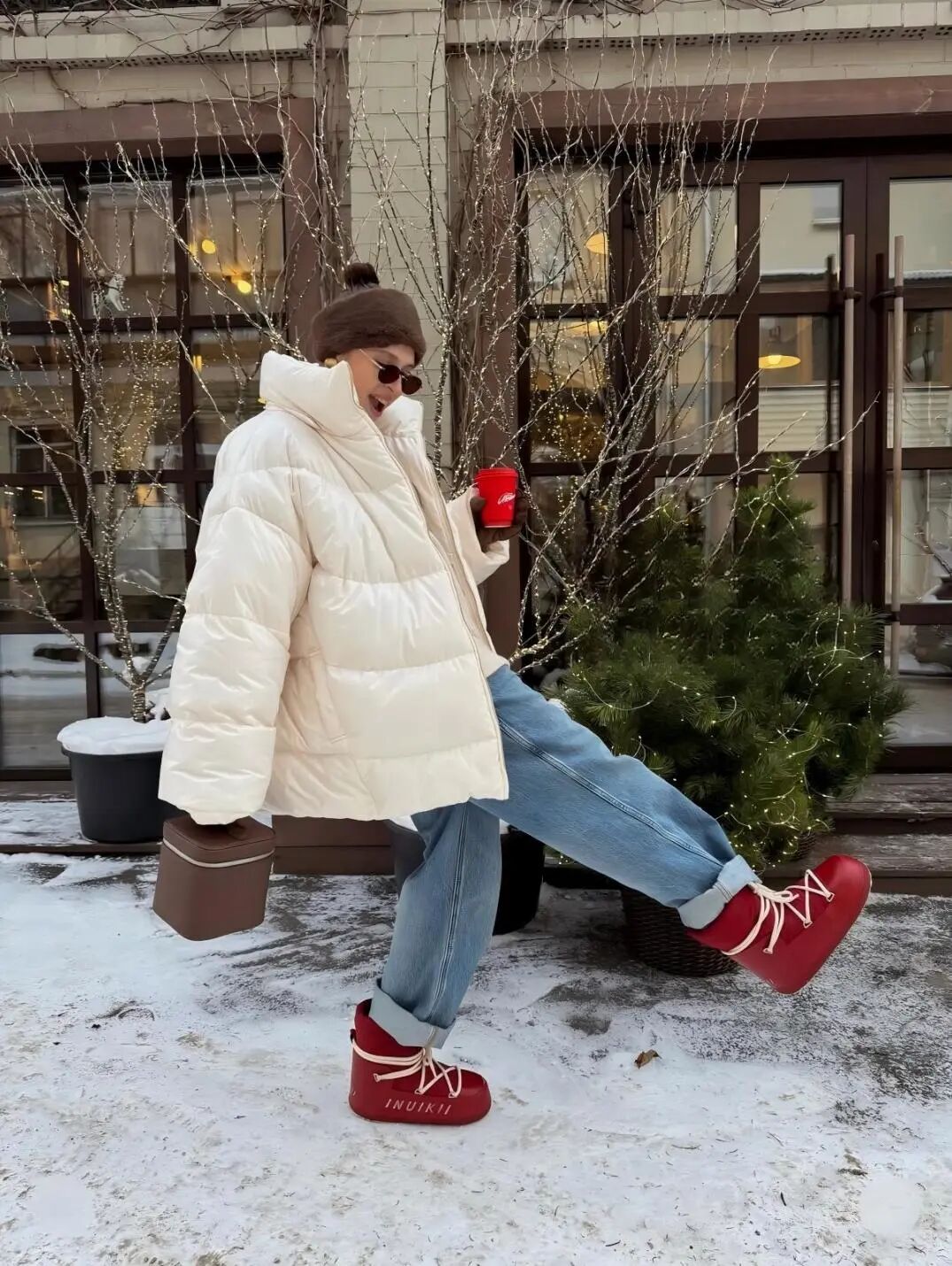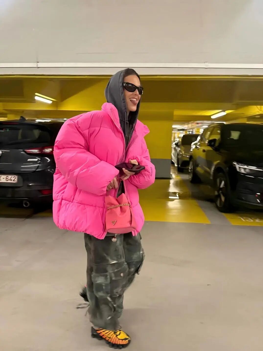 蓬松的羽绒服配连帽卫衣+工装裤……