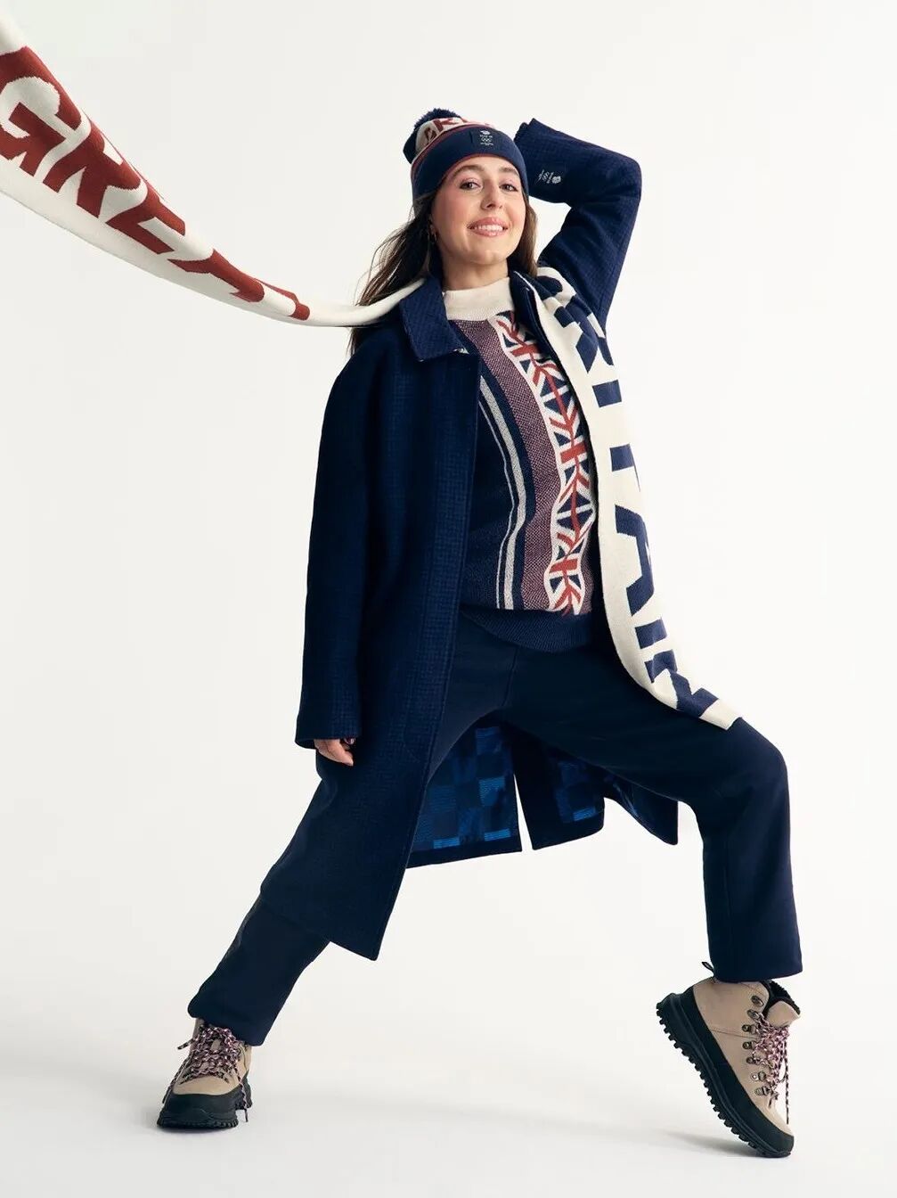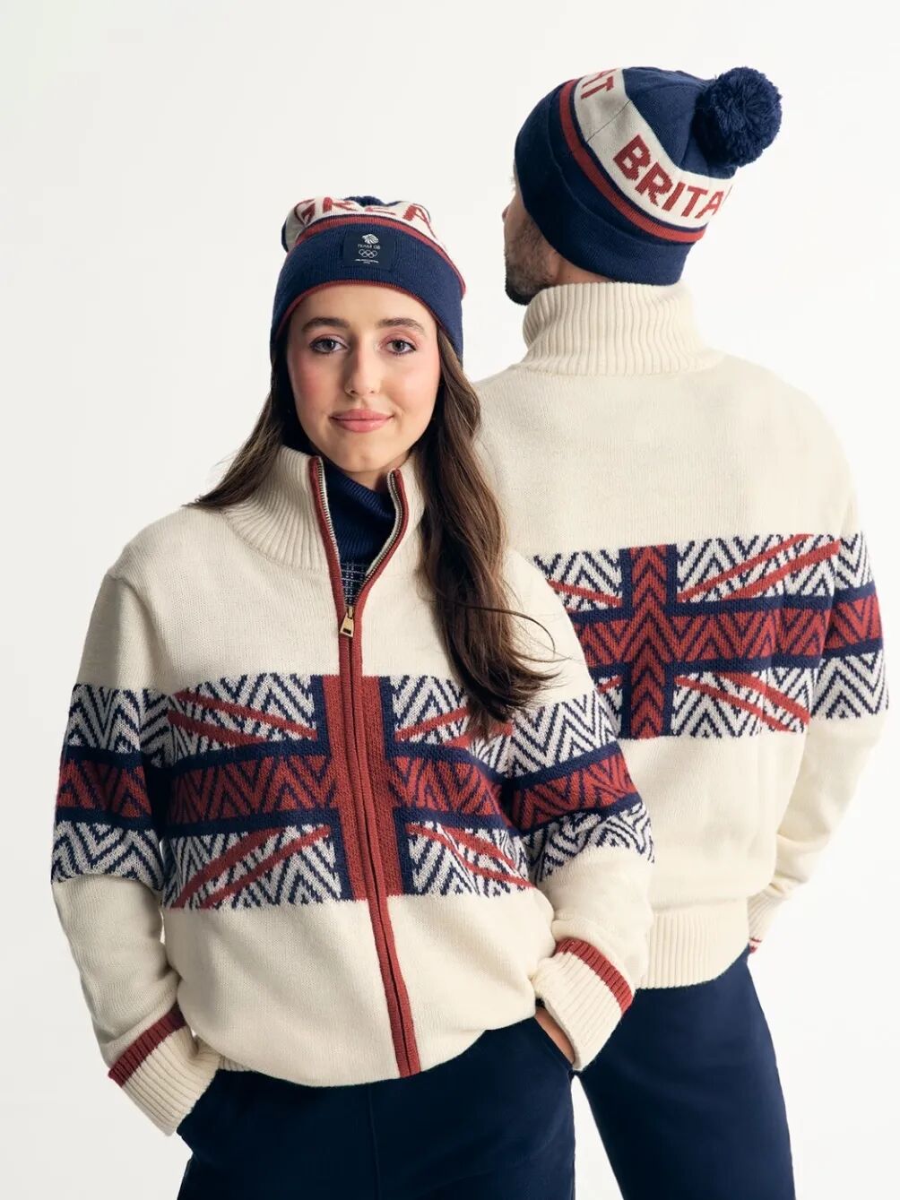 冬日纯白羊毛大衣+国旗嵌花毛衣为主,