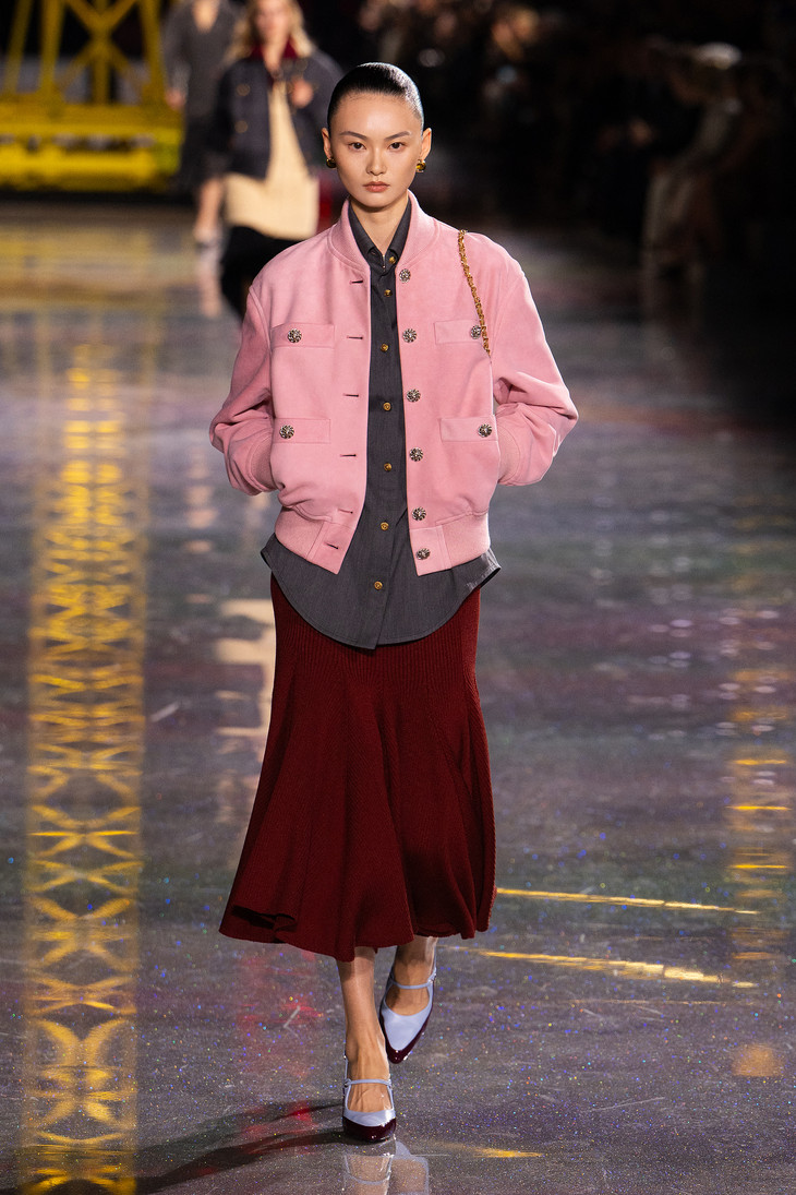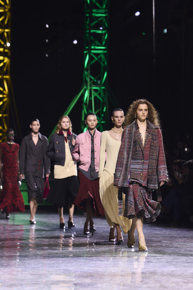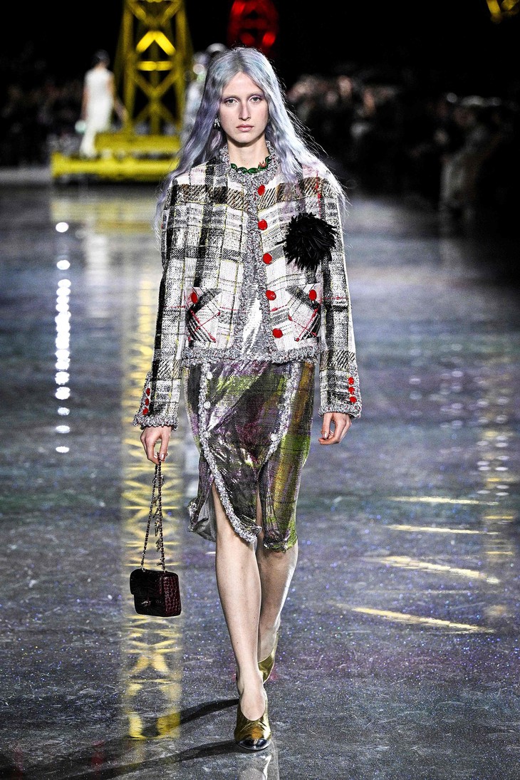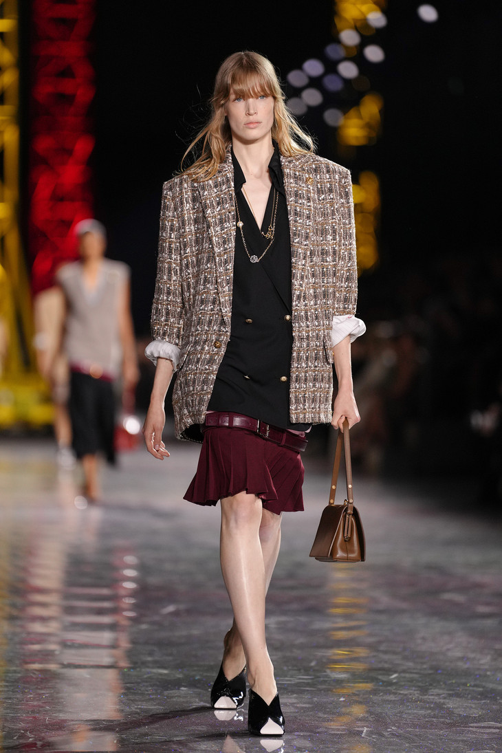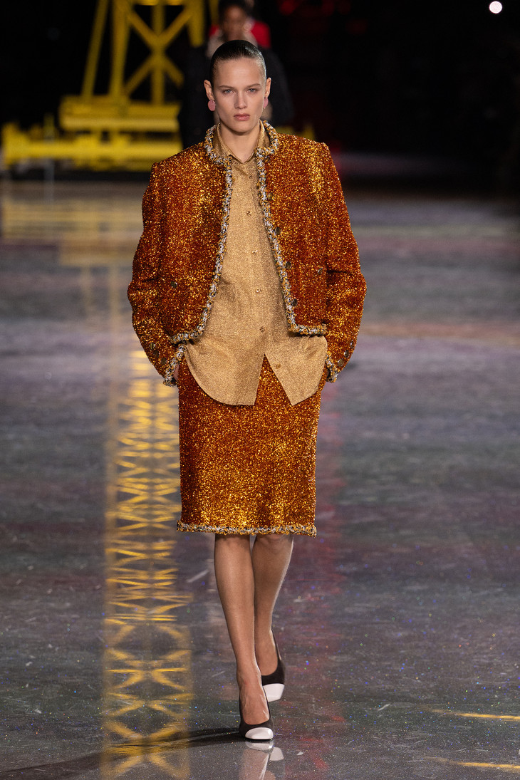 套装作为整个系列的核心载体,映照出穿着者的个性。它被大胆地创新演绎,以罗纹针织、经典斜纹软呢,以及交织人造纤维、金银线、硅树脂与天然薄纱的精美面料打造。标志性的圈圈纱斜纹软呢“工装衬衫”,以及中性气质的压褶斜纹软呢收腰外套,如今都已融入全新的套装风格语汇。二十年代风格套装以丝质针织面料与斜纹软呢混纺而成,流畅、轻盈、舒适;珠绣针织套装展现全新工艺,格外轻便与灵动。