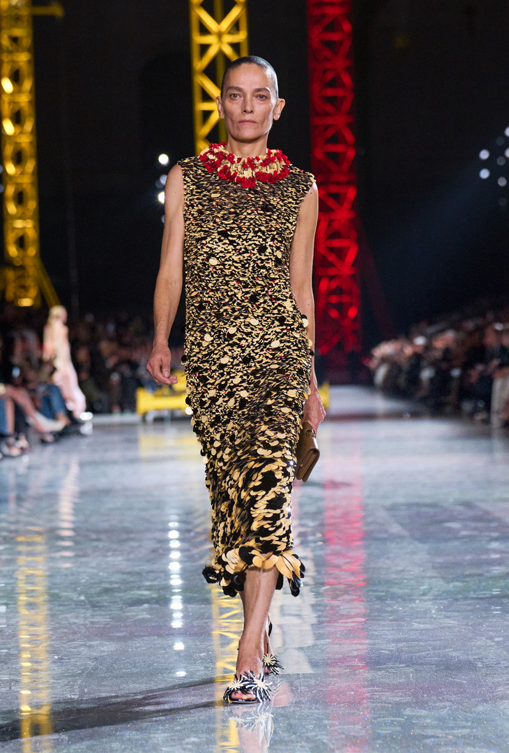 随着白日渐入夜晚,系列作品的绚丽光泽愈发闪亮,结合触感柔滑、流畅的丝绸材质,预示着展翅高飞的时刻即将来临:“夜之蝶”(papillon de nuit)翩然现身。线条利落的大衣与连衣裙以轻盈飘逸的廓形呈现,或剪裁考究,或层叠垂坠,或纯粹简约,或装饰精美,以灵动感为主线,为自如行动而生,令穿着者轻松步入夜色。