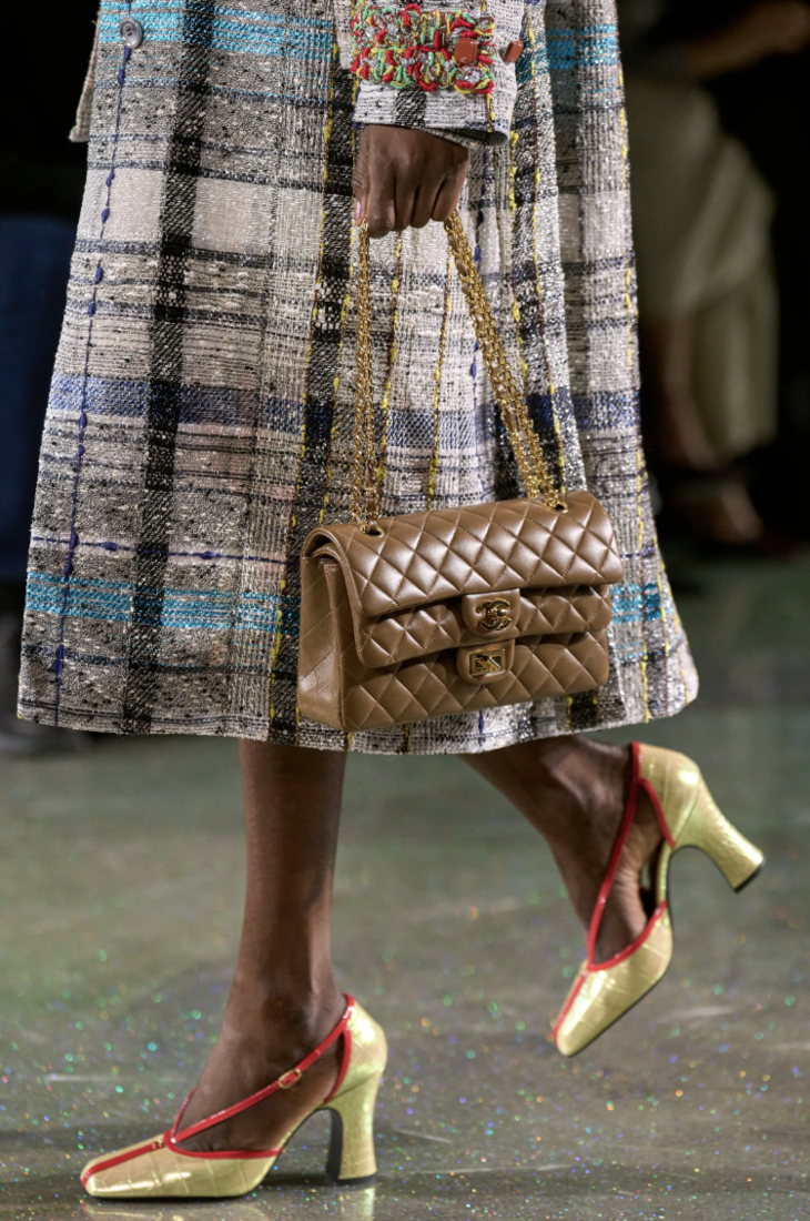 这场真实与虚构的对话,贯穿整个系列,最终在配饰中达到高潮。宛如一幅绚丽的印象派画作,蛋白石般的光彩在色泽浓郁的珐琅与树脂珠宝上流转,也见于手绘的天然珍珠母贝作品中。仿佛第二层肌肤般服帖的拼接装饰长靴,采用质感柔软细腻的粉彩调皮革打造,呈现梦幻气息。手袋款式纷繁多样,在实用与趣味之间游走:时尚必备的麂皮口盖包,其米色版本现已一跃成为新的经典;“菱格纹沙发”的设计灵感,直接取自嘉柏丽尔·香奈儿私人寓所的沙发。从最新的锁扣手袋,再到极尽奢华的石榴造型硬式晚宴包,散发令人沉醉、熠熠生辉的釉面光泽……