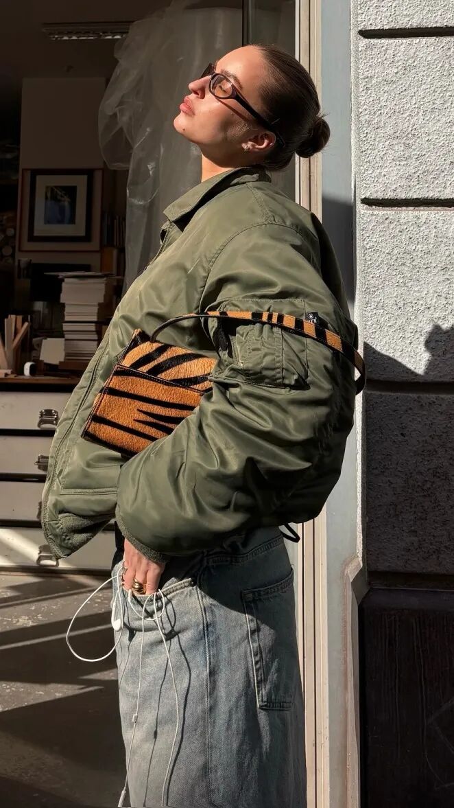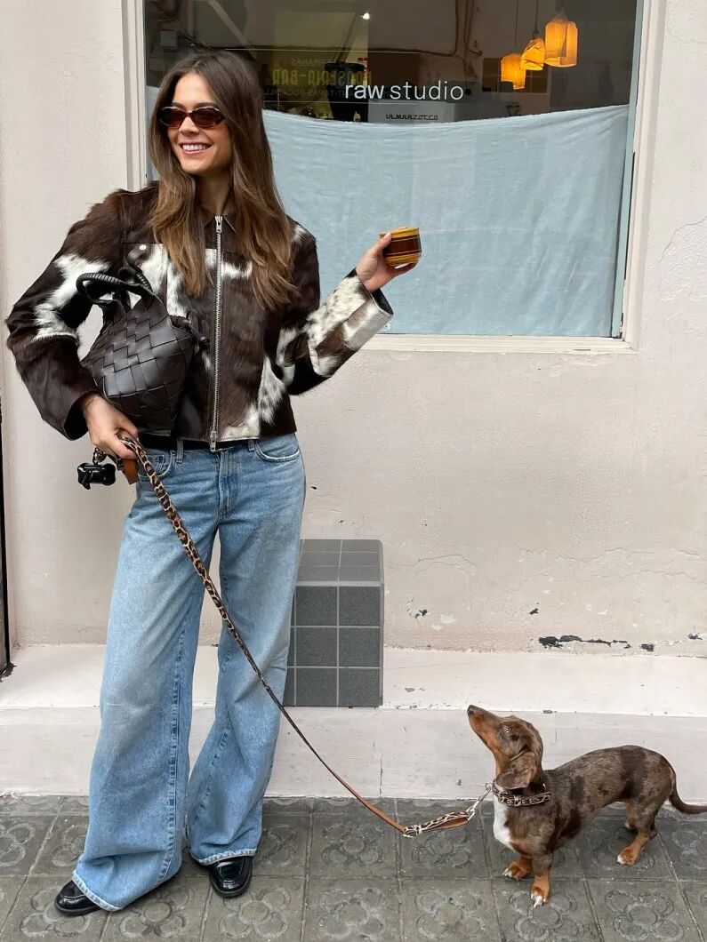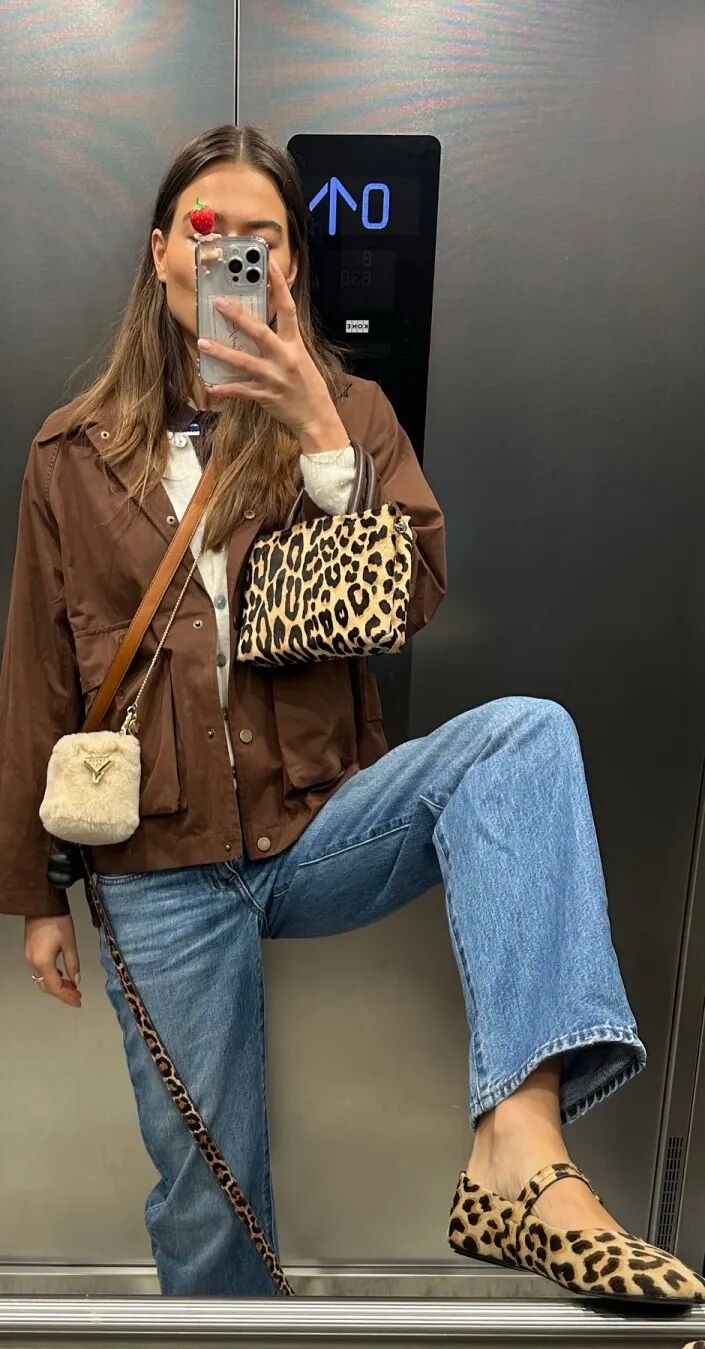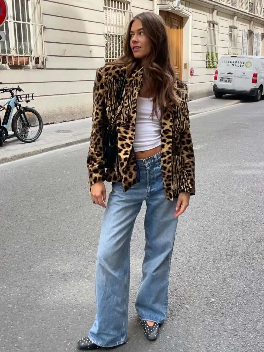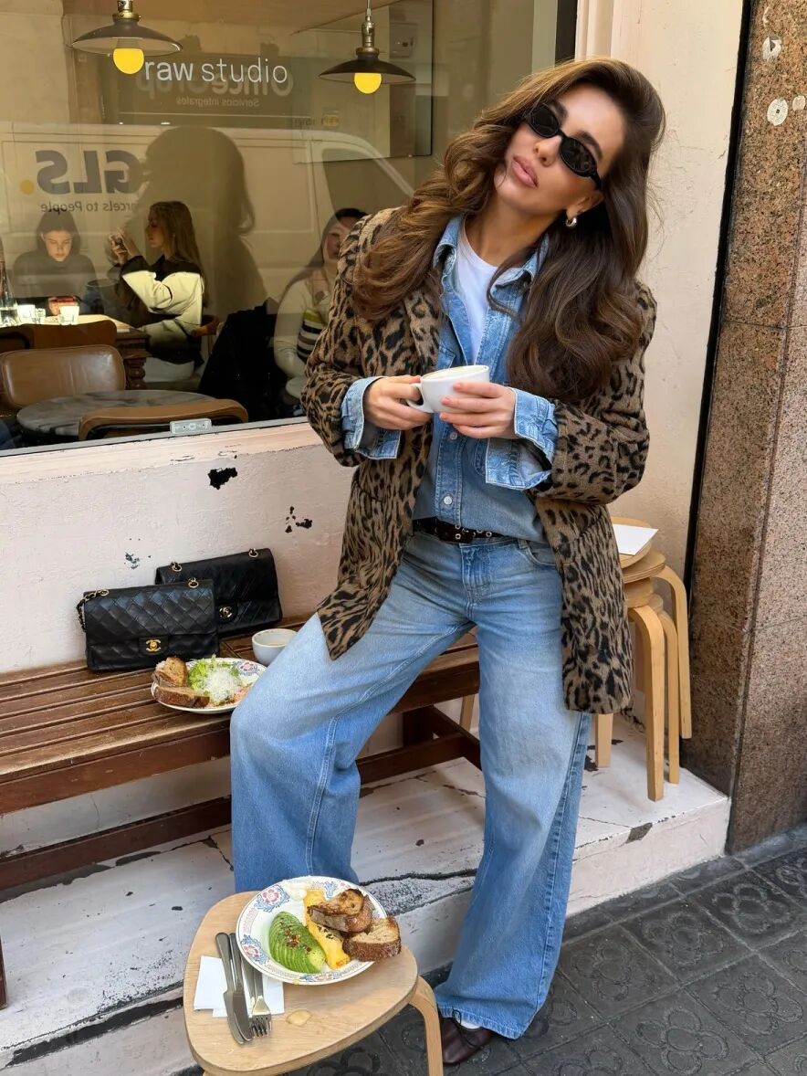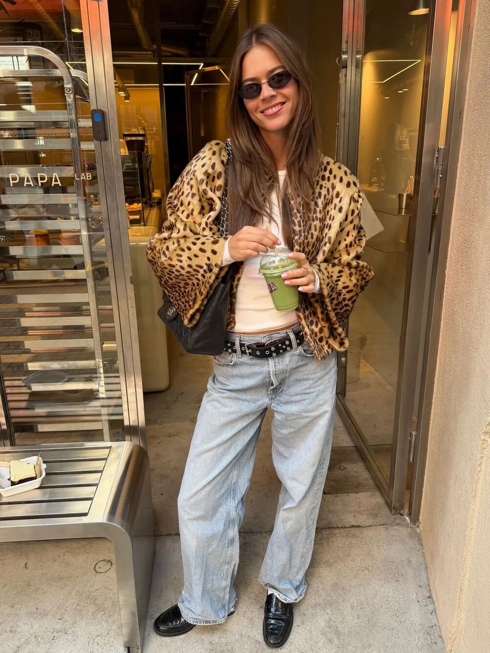 简单松弛的牛仔裤和衬衫让动物纹变得平易近人。