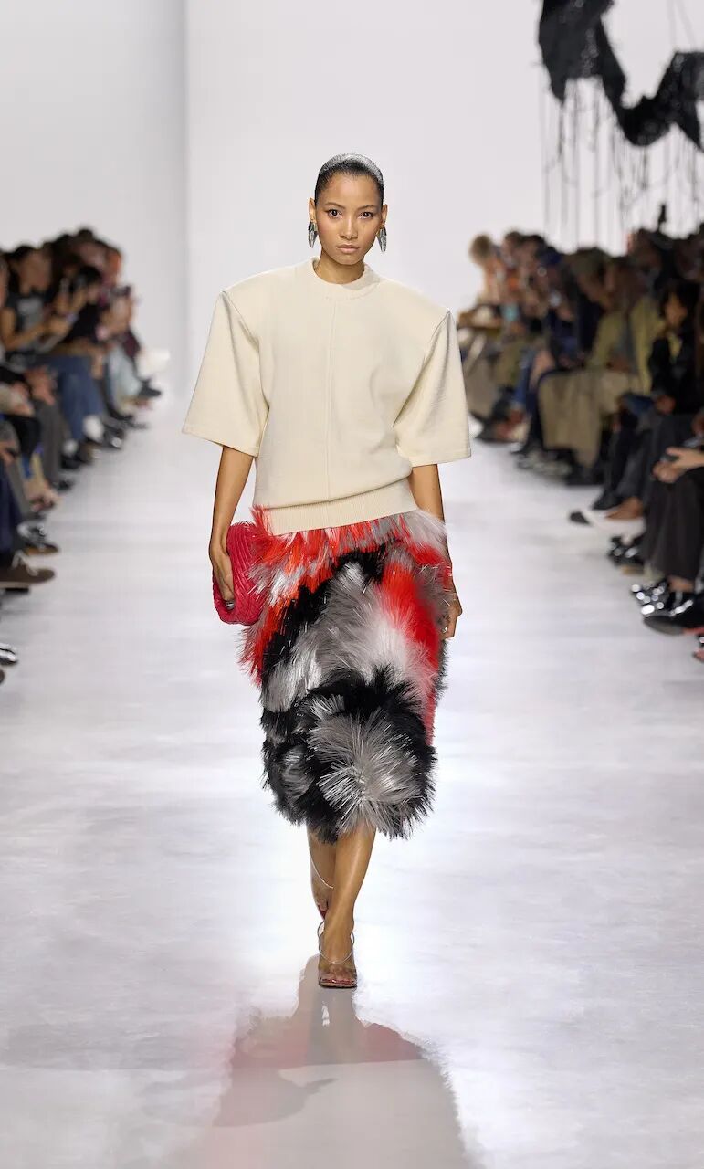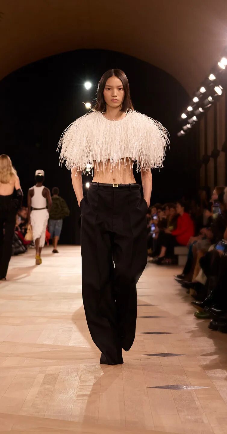 那些似乎无处不在的流苏又该如何理解?我尤其偏爱Bottega Veneta那种用玻璃纤维制成、刺眼的黄色与橙色版本。我甚至想象Trotter把一堆旧电脑主板丢进碎纸机。到了Balenciaga,流苏则更为细腻,仿佛一团环绕着短斗篷的层理分明的白色云雾。设计师们似乎正处于一种“撕碎一切”的情绪之中。有时,生活的挫败感确实会让人渴望如此。