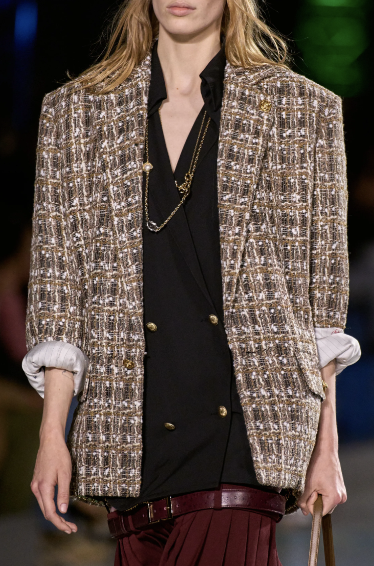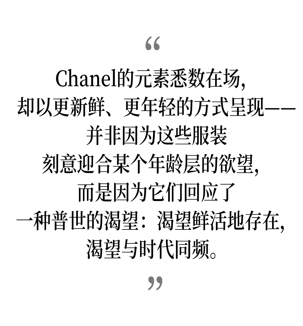 Blazy在Chanel的首个系列中,呈现出大量轻盈的外套,呼应品牌标志性的粗花呢套装传统;还有与Charvet合作推出的宽大衬衫,以及带着男装气质的松垮长裤。但那一个笑容,比任何一件裙装都更能说明这个诞生于1910年,如今成为女性神话与全球商业终极结合体的品牌所处的新纪元。
