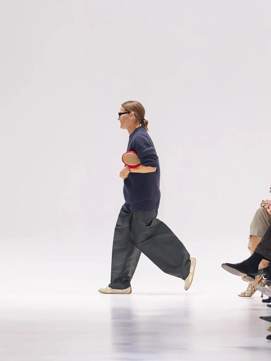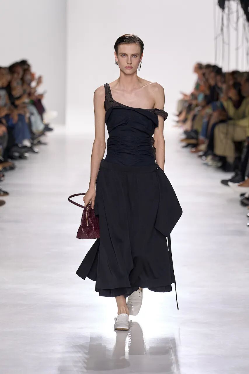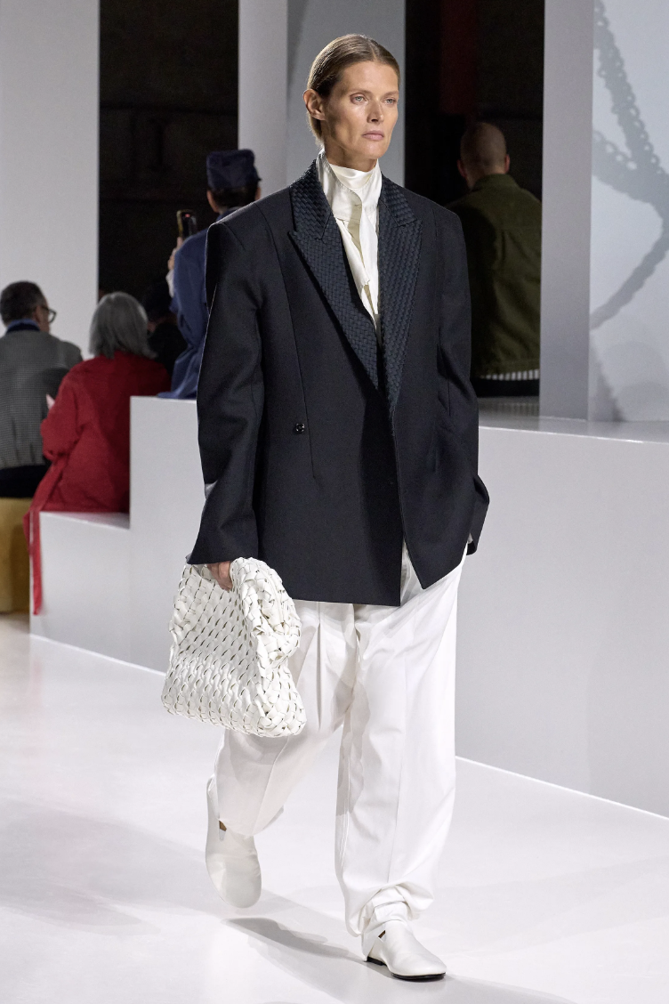 在Bottega Veneta,Trotter为性别光谱、“疲惫妻子”形象与兄弟文化提供了一条审慎的出口。秀场上,男女一同登场,造型彼此呼应,却依然保有那份奇妙而动人的差异。宽松的长裤搭配既利落又饱满有型的西装外套,几乎人人都能欣然接受。连衣裙含蓄地自肩头滑落,而每个人也都有一只合适的好手袋可选。