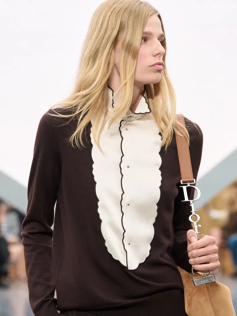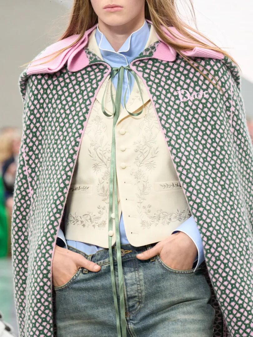 Anderson 以迷你版 Bar Jacket、极短百褶裙,以及宛如工装短裤般外扩的 裙撑(panniers),为 Dior 注入了一丝混乱感。仿佛 CRISPR 技术接管了 Dior 的档案库。过去并非神圣不可触碰,未来也不必受其束缚。