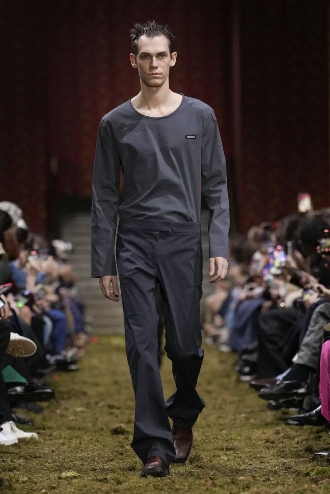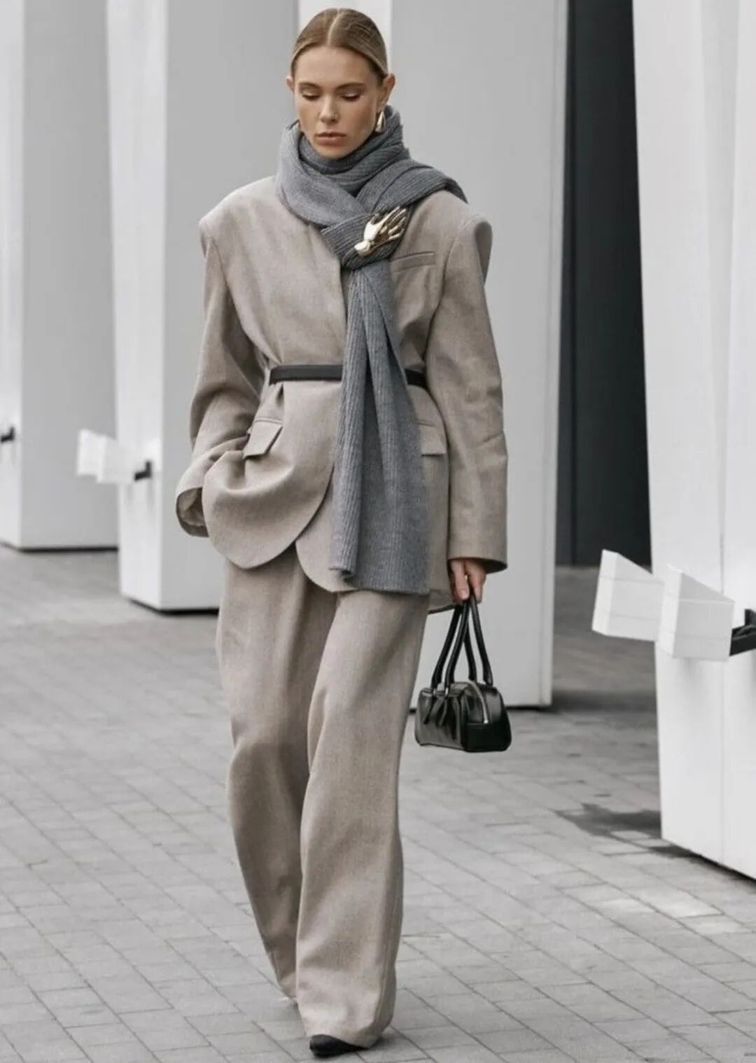 就像秀场中身着灰色阔腿西装的造型,